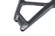 The complex surface design showcases raised sections and deep fillets, which are harmoniously complemented by fluid lines that bring everything together in an organic fashion. The mounting positions are crafted with deeply sculpted pockets that are lined with satin anodized inserts, creating a beautiful contrast against the carbon fiber finish.